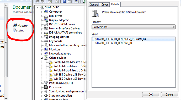 Hello. I am sorry you are having trouble with your Micro Maestro on Windows 7. To help us troubleshoot this, please double-click on “Pololu Micro Maestro 6-Servo Controller” in the Device Manager, go to the Details tab, and select “Hardware Ids”. Please post a screenshot showing those hardware IDs so we can make sure that they are correct.