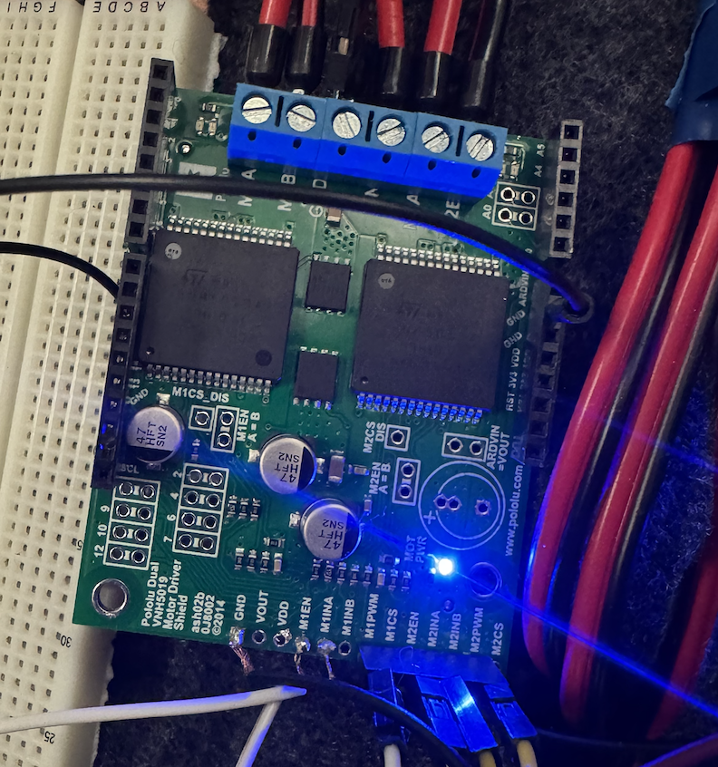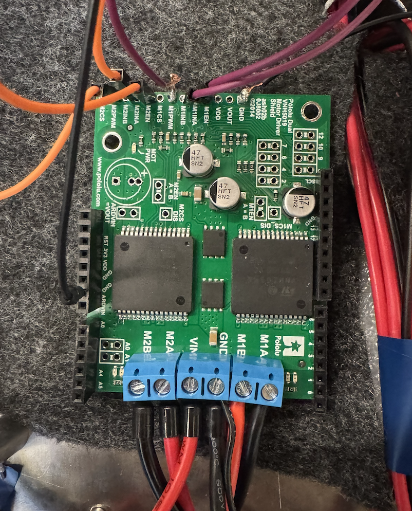 Each of the two drivers is hooked up to a 12V battery through its Vin and GND port, and then hooked into the motors between M1A, M1B, and M2A, M2B, respectively. We’ve soldered the EN, PWM, and IN pins for each of the two motors, as well as the ground. Additionally, we added a common ground on the right-side terminal for the battery. This setup can be seen in the attached photo below