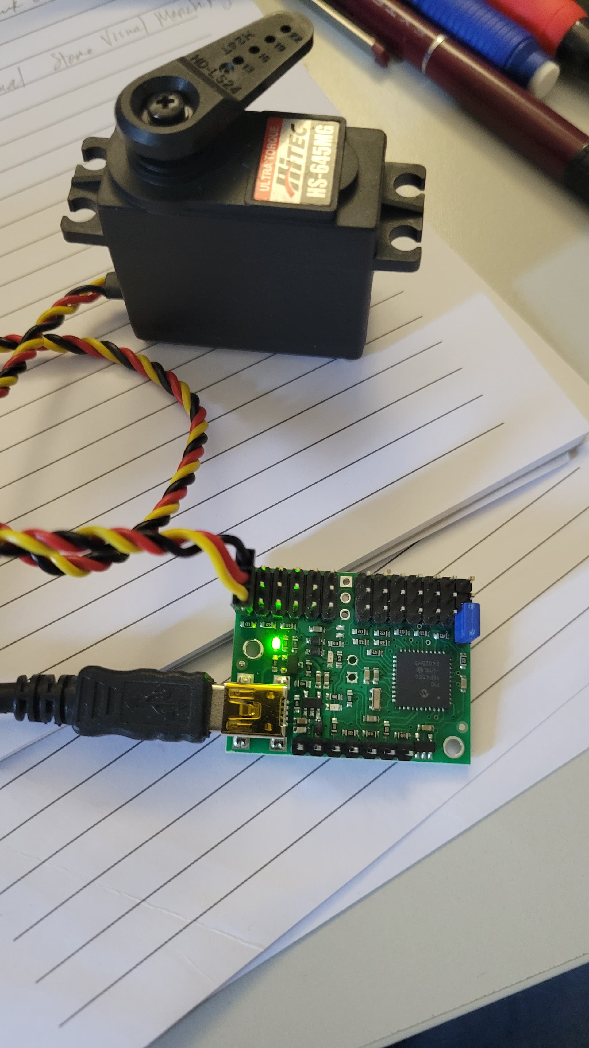Hi! I just received my Mini Maestro 12, downloaded the Control Center Software for Windows 11, and connected the Maestro with USB to power the controller and 1 servo. The servo is active in the Control Center Software, I have USB Dual port set in the Serial settings and Channel 0 named but not able to control my servo. I believe my jumper setting is correct but not sure…I have a flickering Green status light and the yellow light is flashing twice every second (see pic). Can someone assist in troubleshooting?