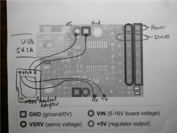 The final power pin arrangement was just like the drawing above. I hooked up a 12V 1A wall wart to the servo PWR and GND pins and a phone charger (5V 1A) to the USB plug.