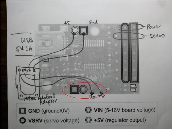 The circled pins line up conveniently with the pins of the xbee explorer (power regulated - 3.3-16V input) board. I use a 4-pin female/female jumper wire to connect them which keeps things neat on my airplane and quadcopter. You could also use a 3-pin jumper if you don’t need feedback from the servo controller.