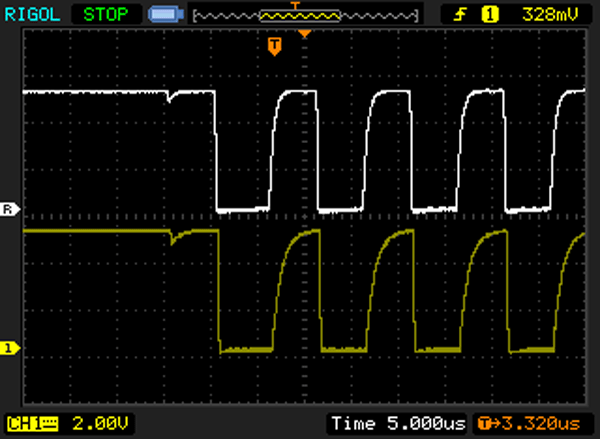 I’ve got my 3 Baby-O’s exchanging msgs between each other over TWI/I2C. I was content with things working until today I had a cheap storage scope arrive in the mail. Now I can see my I2C data line is really getting tweaked by I2C clock pulses, and my I2C clock look like shark fins.