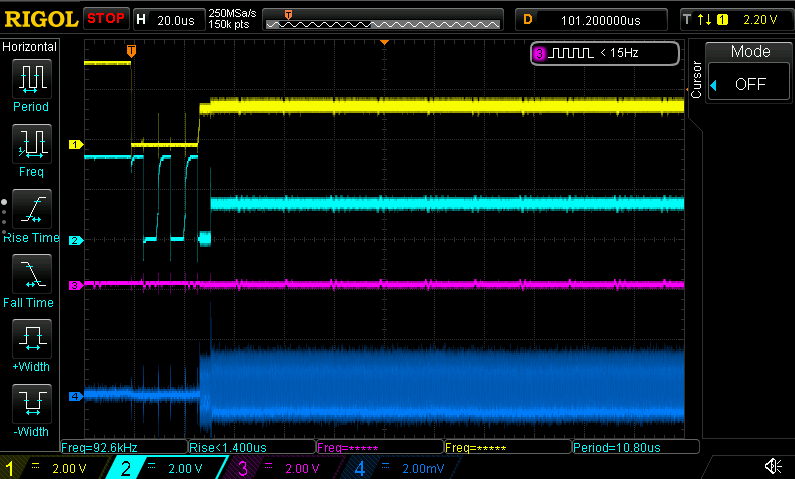 The situation is recorded with the oscilloscope. It is triggered by the raising of the Core/IOVDD level (to 1.8V) while the VL53L8CX is inserted into the board and gains electrical connection to the pins.